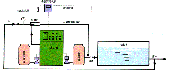 采用鹽酸與氯酸鈉定量注入到反應(yīng)釜內(nèi),反應(yīng)釜在加熱的情況下發(fā)生化學反應(yīng)生產(chǎn)二氧化氯與氯氣,再通過水射器吸入投加到消毒水體中。工藝采用負壓曝氣、正壓注入的技術(shù)來生產(chǎn)二氧化氯消毒液。
